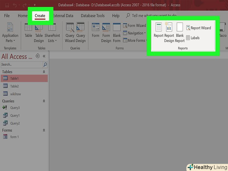 Натисніть вкладку "створення".виберіть тип необхідного звіту. Існує кілька різних шляхів створення звітів. Access може зробити звіт для вас автоматично, або створіть його самостійно.- Звіт - буде створений автозвіт, що використовує всю доступну інформацію з вашого джерела. Нічого не буде згруповано, але для невеликих баз даних цілком підійде.