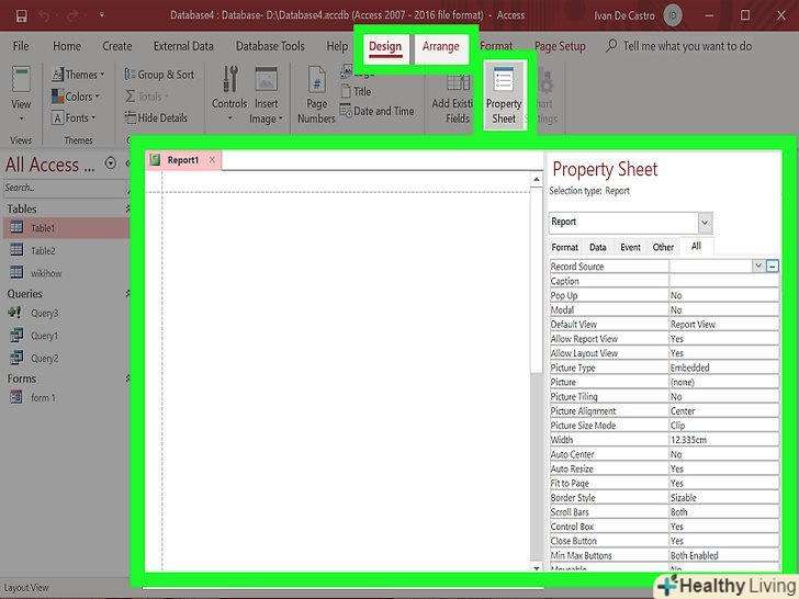 Виберіть джерело для порожнього звіту.якщо ви вибрали створення порожнього звіту, вам потрібно вказати для нього джерело. Спочатку натисніть вкладку "упорядкувати«, а потім перейдіть в»Властивості". Для цього також можна натиснути Alt + Enter.- Натисніть на стрілочку поруч з полем "джерело записів". З'явиться список всіх доступних таблиць і запитів. Виберіть один, і він буде віднесений до звіту.