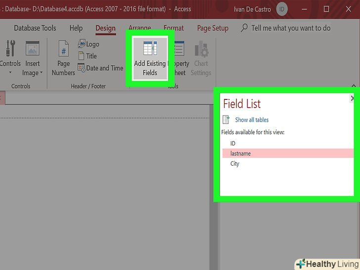 Додайте поля до звіту.вказавши джерело, додайте поля з нього в свій звіт. Натисніть вкладку "Формат", потім натисніть "Додати існуючі поля". Список полів доступний у правій частині.- Натисніть і перемістіть поля, які необхідно додати в розділ "Конструктор". Запис з'явиться у звіті. При додаванні додаткових полів вони будуть додаватися автоматично до вже існуючих.