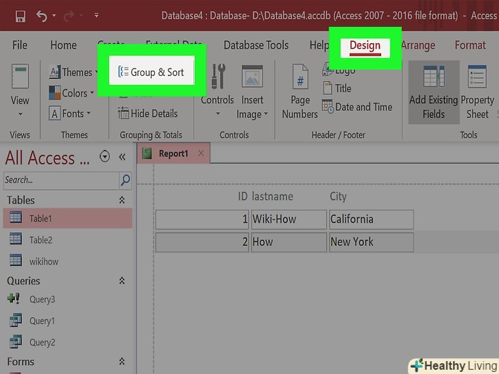 Додайте групи до свого звіту.групи дозволяють швидко розбиратися в інформації зі звіту, оскільки все подається в організованому вигляді. Наприклад, якщо вам необхідно створити групи для продажів по регіону або з прив'язкою до продавця, все це можна зробити за допомогою угруповання.- На вкладці "Конструктор", виберіть "групування".