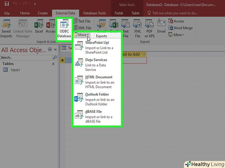 - Виберіть тип файлу, який збираєтеся імпортувати. У розділі "імпорт та об'єднання" ви знайдете кілька варіантів для вибору. Натисніть кнопку "більше", щоб відкрити ще більше варіантів вибору. ODBC-це протокол для підключення баз даних, наприклад таких як SQL.