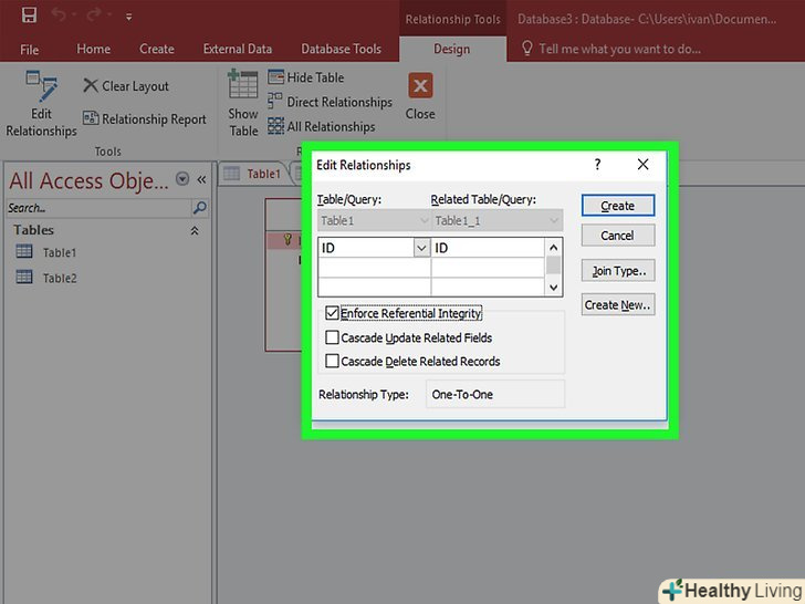 Перетягніть поле, яке ви хочете використовувати як зовнішній ключ.перемістіть його в заздалегідь приготоване поле для зовнішнього ключа. Натисніть "створення" у вікні, щоб створити зв'язок між полями. З'явиться лінія між двох таблиць, зв'язавши тим самим поля.- При створенні зв'язків встановіть прапорець у графі»забезпечити цілісність даних". Ця функція дозволяє вносити зміни в друге поле при зміні першого, що виключає неточність даних.