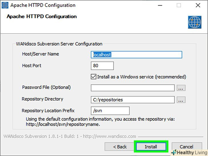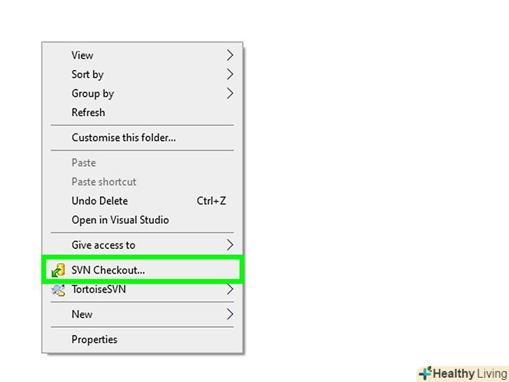 Відкрийте оглядач Windows (explorer), перейдіть в нову директорію і клацніть правою кнопкою миші на порожньому просторі папки. З'явиться контекстне меню оглядача, в якому будуть присутні і команди Subversion, додані програмної TortoiseSVN. Клацніть по опції ' SVN витягти (SVN Checkout)....- Адреса репозитарію (URL Repository): це URL адреса репозитарію, над яким ви хочете працювати. Це адреса репозитарію, або частини репозитарію для якого ви хочете створити робочу копію. Ви можете отримати URL адресу репозитарію у вікні репозитарію в uberSVN: