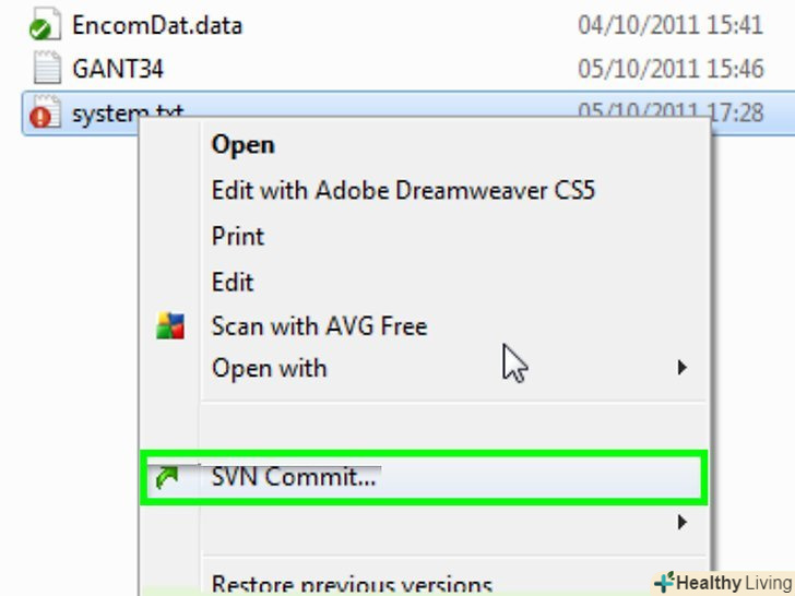 Протестувавши зміну, пора додати їх в репозитарій. щоб застосувати зміни до репозитарію, який ви створили в своїй локальній копії, вам потрібно використовувати команду SVN фіксувати (SVN Commit. Прим: далі просто комміт). Ви можете вибрати окремі файли або їх директорії, потім клікнути правою кнопкою миші, щоб викликати контекстне меню. В меню, клікніть SVN фіксувати (SVN Commit)....