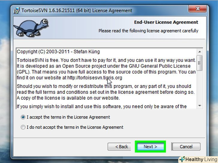 Ви побачите вікно з привітанням, яке підтверджує версію програми Tortoise, яку ви збираєтеся встановити.клікніть на кнопку Далі (Next) gt;