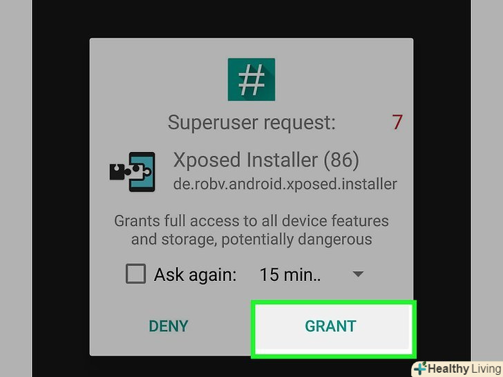 Натисніть " Grant "(дозволити), щоб надати додатку Xposed привілеї суперкористувача.це дозволить Xposed вносити зміни в системні файли Android.