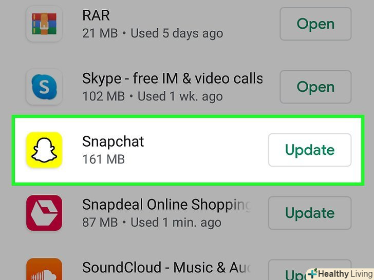 У списку знайдіть додаток Snapchat.якщо для Snapchat є доступні оновлення, вони будуть вказані в розділі "доступні оновлення«, а в правому нижньому кутку вікна відобразиться кнопка»Оновити".- Або знайдіть додаток Snapchat безпосередньо в Google Play Market, а потім відкрийте його сторінку.