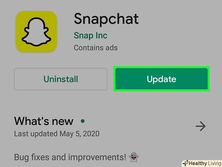Натисніть "Оновити".якщо оновлення доступні, ця кнопка відобразиться на сторінці програми в Google Play Market. Натиснувши "оновити", ви запустите процес скачування файлів з оновленнями, який займе кілька хвилин. Оновлення буде встановлено автоматично, і система повідомить вас про закінчення цього процесу.- Якщо доступних оновлень немає, на пристрої встановлена найостанніша версія Snapchat. Якщо встановлена ОСТАННЯ версія, але деякі функції не працюють (наприклад, функція «лінзи»), швидше за все, пристрій не підтримує ці функції.
