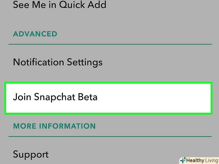 Подумайте про встановлення бета - версії додатка Snapchat.завдяки цій версії можна отримати доступ до найостанніших функцій Snapchat, але бета-версії менш стабільні. Якщо ви готові до того, що додаток може працювати зі збоями, встановіть бета-версію Snapchat.[1]- Прокрутіть меню "Налаштування" вниз і натисніть "встановити бета-версію".