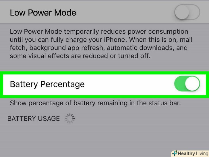 Пересуньте повзунок уЗаряд у відсотках в положення «включити». у правому верхньому куті екрану iPhone відобразиться число і символ відсотків. Число показує рівень заряду батареї.- Якщо увімкнено режим економії енергії, заряд у відсотках відображатиметься за умовчанням.