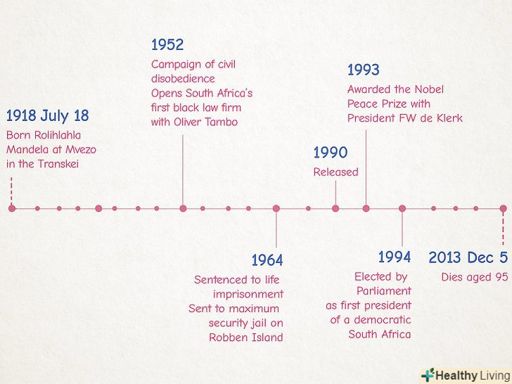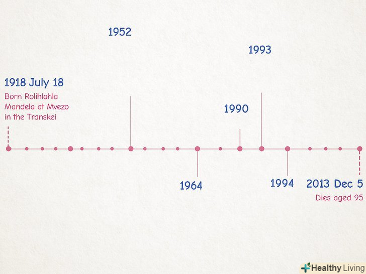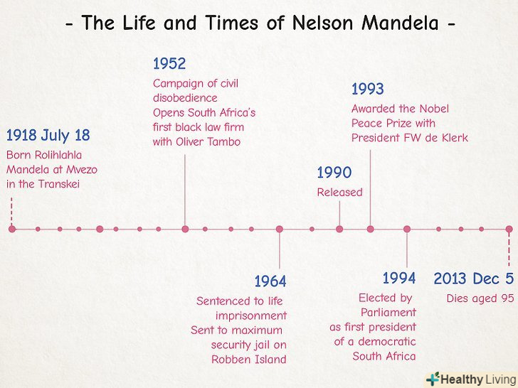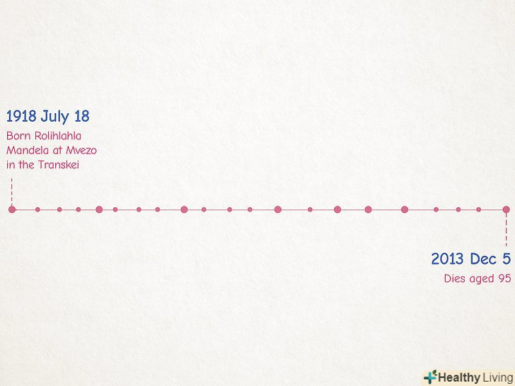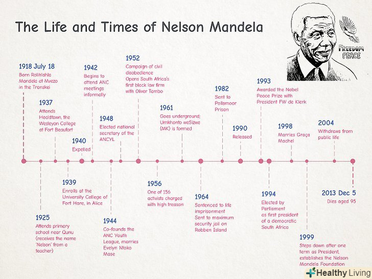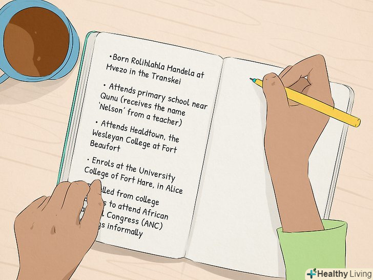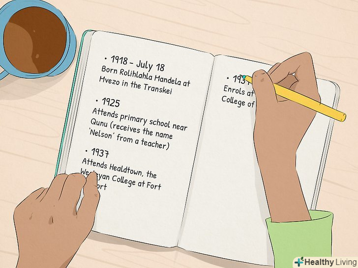 Складіть список подій, які додасте в хроніку.включіть не тільки основні, а й інші доречні і цікаві події по своїй темі. Звичайно, в хроніці не потрібно відхилятися від головного курсу, однак важливо, щоб інформація захоплювала глядача/аудиторію і показувала ваше розуміння теми.[2] намагайтеся не вказувати більше двадцяти подій в хроніці і додайте не менше п'яти подій всередині неї.[3] ось, що можна включити:- Особисті дані (наприклад, дні народження і смерті, а також інші важливі дати);