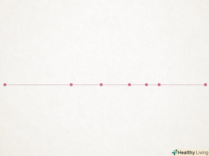 Виберіть часові періоди.залежно від проміжку часу, з яким ви працюєте, можна вибрати періоди в десятиліттях, роках, місяцях або навіть днях. Визначте, що підходить для вашої теми та кількості подій, які ви додаєте. Створіть відповідне число рівномірно розташованих ліній перпендикулярно основній часовій шкалі між початковою і кінцевою датами.[7]- Ці часові періоди не є роками подій. Вони являють собою рівномірно розподілені інтервали, такі як 5 років, 10 років або 20 років. Наприклад, можна відзначити 1920, 1930, 1940 і 1950 роки, навіть якщо події відбуваються в 1923, 1928, 1938 і 1943 роках.