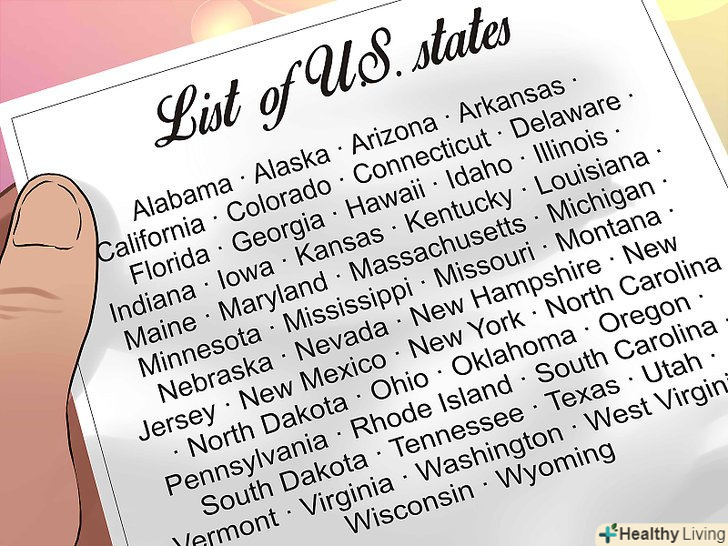 Всякий раз, коли Вам потрібно запам'ятати список, повторюйте його вголос або в письмовій формі стільки разів, скільки ви можете. Здається, що повторити назви п'ятдесяти Штатів-це важко, але це може бути набагато простіше, якщо у вас є пісня або спеціальна фраза, яка допоможе вам запам'ятати порядок, за яким вони йдуть.