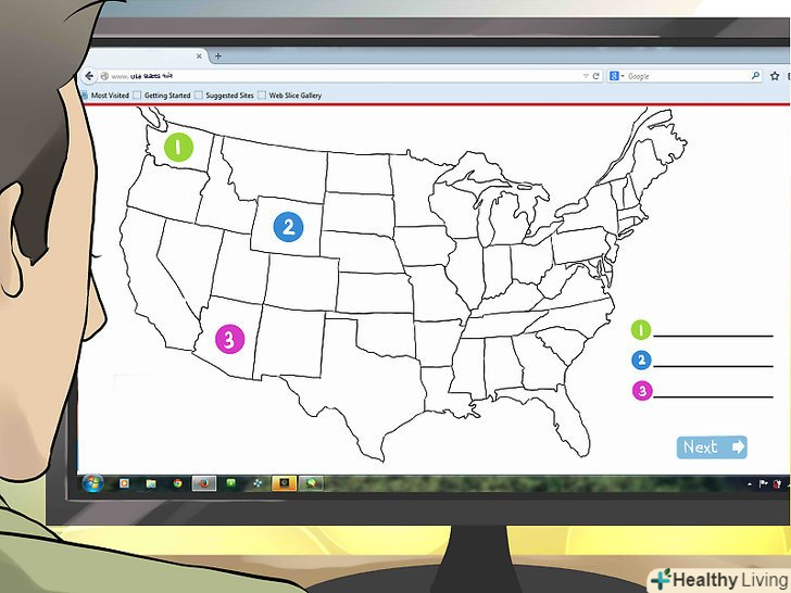 Використовуйте онлайн вікторини.онлайн-вікторина може надати вам велику допомогу в запам'ятовуванні кожного штату окремо, без необхідності повторювати кожен раз довгі списки. Спробуйте цю вікторину, яка дозволяє вибрати рівень (»вивчення«,» тест«, або"складний тест"). Прочитайте питання, потім натисніть на частину картинки, де на вашу думку, знаходиться цей штат.