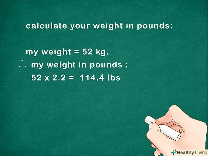 Помножте вагу, виміряну в кілограмах, на 2,2, щоб обчислити вагу, виміряну в фунтах.оскільки кожен кілограм дорівнює 2,2 фунта, просто помножте кількість кілограмів на вказане число, щоб знайти кількість фунтів:- 100 кг = 2,2 (фунт/ кг) * 100 кг = 220 фунтів