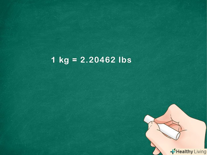 Запам'ятайте, що кожен кілограм конвертується в 2,2 фунта.тобто 1 кг = 2,2 фунта. Це означає, що 2 кг = 4,4 фунта, 3 кг = 6,6 фунтів і так далі.- 1 кг * 2,2 (фунт/кг) = 2,2 фунта.