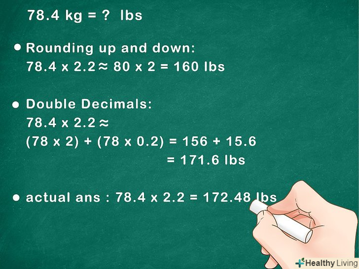 - Метод округлення чисел вгору і вниз. Округліть числа так, щоб з легкістю перемножити їх і отримати саме приблизне значення. У цьому прикладі округліть 78,4 кг до 80 кг, а 2,2 фунт / кг до 2 фунт / кг: