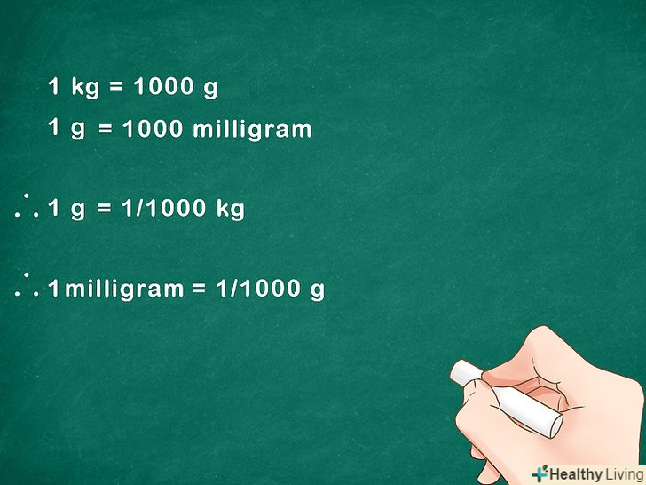 Перетворіть одні метричні одиниці вимірювання ваги в інші, які представляють собою число 10 в певній мірі.основною метричною одиницею вимірювання ваги є грам (г). Всі інші метричні одиниці вимірювання ваги рівні грамам, помноженим на 10 певною мірою, що описується приставкою. Наприклад,» кіло "означає 1000, а кілограм дорівнює 1000 грамам; "Міллі" означає 1/1000, тому кожен міліграм (мг) дорівнює одній тисячній грама (тобто, 1000 міліграм = 1 грам).- 1 кг = 1000 г