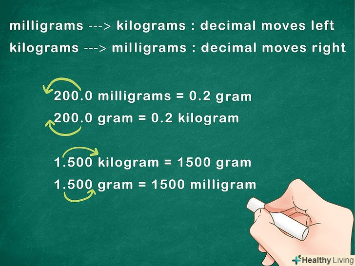 - Щоб швидко перетворити 1 г в 0,001 кг, перемістіть десяткову кому на три позиції вліво (1 → 0,1 → 0,01 → 0,001).