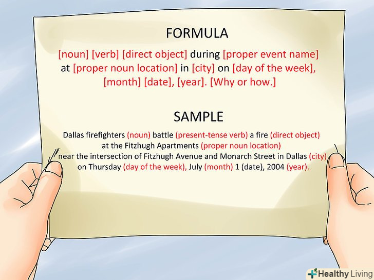 Використовуйте загальну формулу.на перших порах можна використовувати для підписів чітку формулу. Згодом ваші навички дійдуть до автоматизму, і ви будете повністю або частково відтворювати таку формулу, але до тих пір використовуйте формулу як шпаргалку, щоб не забути важливих деталей.[25]- Використовуйте таку формулу: [іменник] [дієслово] [пряме доповнення] [ім'я власне як назва події] [ім'я власне як назва місця] в [місто] в [день тижня], [число], [місяць], [рік]. [Як або чому].