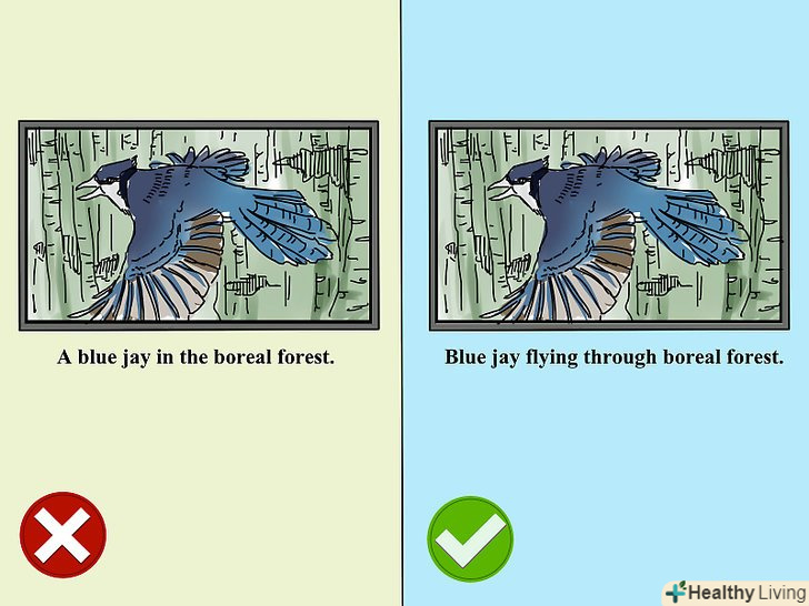 Не використовуйте на початку підпису деякі слова. підпис не повинен починатися словами"це" або "тут". Підписи англійською мовою не слід починати з артиклів. Занадто загальні слова займають корисний простір і не додають сенсу. Наприклад, замість " це сойка в тайговому лісі "краще вказати"Сойка в тайзі".[5]- Не починайте підпис з імені. В першу чергу слід використовувати описове слово, а потім вказати ім'я. Не пишіть "Сергій Алексєєв на тлі Кремля". Краще написати"марафонець Сергій Алексєєв на тлі Кремля".