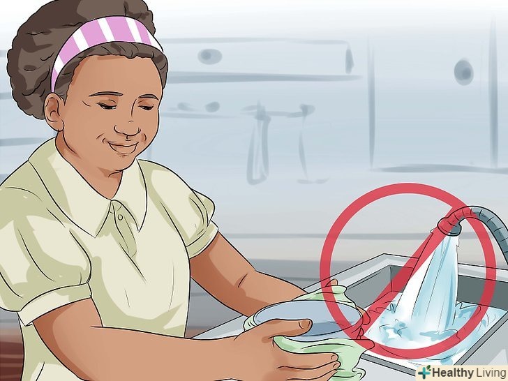 Економно витрачайте воду.вода - це необхідний життєвий ресурс, який ми часто сприймаємо як належне. Вода, яка біжить з нашого крана, проходить довгий шлях. Її потрібно закачати з джерела водопостачання, відфільтрувати і обробити хімічними реагентами і доставити в наш будинок по водопроводу. Для здійснення цього процесу необхідна велика кількість енергії. Якщо ви економно витрачаєте воду, то вносите свій посильний внесок у зниження навантаження на ваш місцевий джерело водопостачання. Це особливо важливо, якщо ви живете на території, де існує загроза посухи. Для економії води ви можете зробити наступне:[6]- Не залишайте кран відкритим під час миття посуду. Коли ви миєте посуд, намагайтеся витрачати менше води.