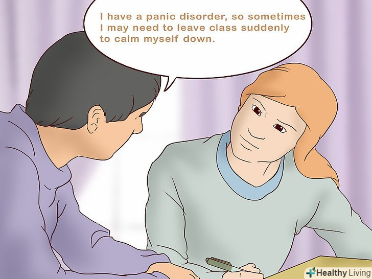 Поговоріть з викладачами.у більшості вузів, студентам потрібно попросити дозволу, щоб вийти в вбиральню або куди-небудь ще. Слід розуміти, що відлучаючись з аудиторії під час нападу, можна пропустити важливий матеріал або викликати невдоволення викладача, якщо ви будете поспішати до виходу занадто шумно. Поставте викладачів до відома про свою проблему і придумайте, як краще попереджати їх про критичну ситуацію.- Наприклад, підійдіть до викладача після заняття і скажіть: "Я страждаю від панічного розладу, тому іноді мені потрібно буде раптово покинути аудиторію, щоб взяти себе в руки. Хочу запитати, як мені краще попереджати вас, щоб не заважати проводити заняття. Що можете порадити?”