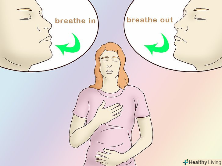 Дихайте глибоко.у момент паніки різко частішає серцебиття, можуть з'явитися хворобливі відчуття в грудях, тремтіння в руках, задишка, пітливість і інші ознаки.[6] приведіть дихання в норму, щоб взяти себе в руки і послабити паніку.- Сядьте на стілець, на кришку унітазу в туалеті або на підлогу в коридорі і упріться спиною в стіну. Одну руку покладіть на грудну клітку, а другу на живіт. Повільно вдихайте через ніс і також неспішно видихайте через рот.