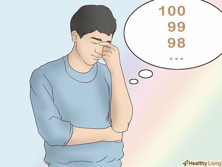 Відволікайтеся.іноді необхідно навмисно відволіктися, щоб впоратися з панікою. Хитрість в тому, щоб зайняти себе іншими думками і дочекатися, поки симптоми ослабнуть. Використовуйте один з наступних способів, щоб розслабитися:[7]- Вважайте. Почніть рахувати чорні плитки на підлозі в Вбиральні, порахуйте в зворотному порядку від ста до одного або згадуйте таблицю множення (1x1=1, 1x2=2 і так далі).