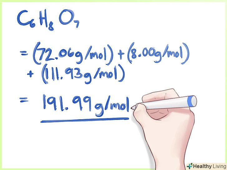 молекулярна маса C6H8O7 = 72,06 г / моль + 8,00 г / моль + 111,93 г / моль = 191,99 г / моль