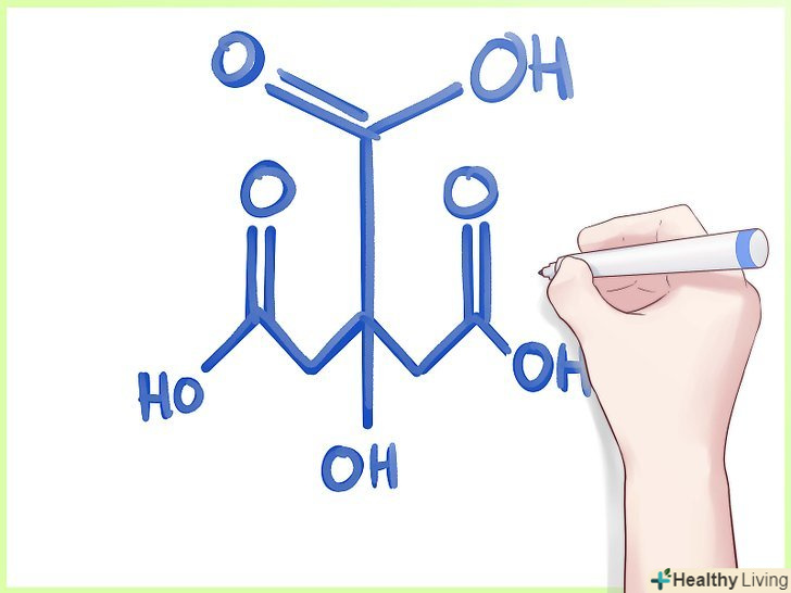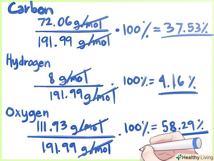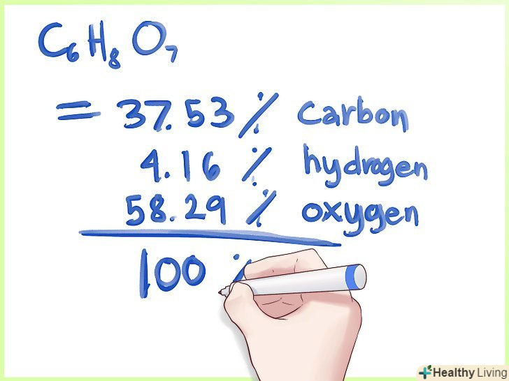 Знайдіть масовий склад у відсотках.Масова частка елемента у відсотках обчислюється як відношення масового вкладу даного елемента до загальної молекулярної маси сполуки, помножене на 100%.- У нашому прикладі масові відсотки кожного елемента розраховуються так, як показано на малюнку. Таким чином, C6H8O7 складається з 37,53% вуглецю, 4,16% водню і 58,29% кисню.