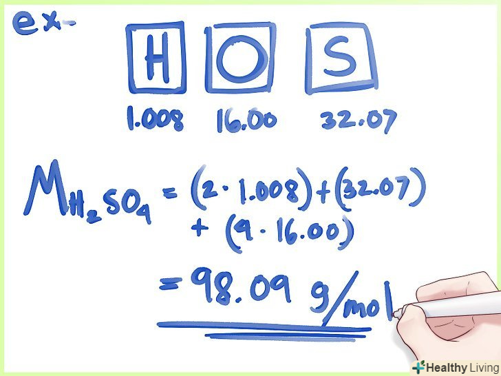 Обчисліть загальну молекулярну масу вашого з'єднання.Загальна молекулярна маса дорівнює сумі масових вкладів кожного елемента, і відповідає масі однієї молекули сполуки.- У нашому прикладі молекулярна маса розраховується так:
