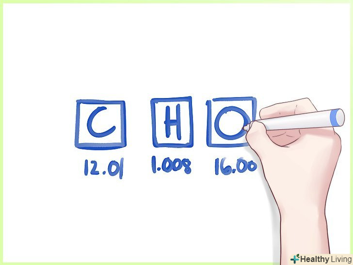 Випишіть атомну масу кожного елемента.для визначення атомних мас використовуйте періодичну таблицю елементів (таблицю Менделєєва). Як правило, атомна маса наведена в цій таблиці відразу під символом відповідного елемента, і виражена в одиницях г/моль.- Для наведеного вище прикладу знаходимо: атомна маса вуглецю дорівнює 12,01 г/моль, водню - 1,00 г/моль, кисню - 15,99 г/моль.