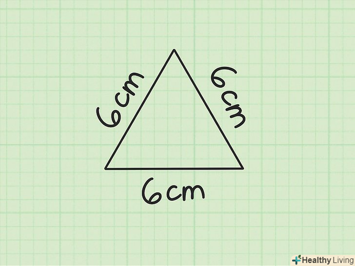 Знайдіть довжину однієї сторони трикутника. у рівносторонньому трикутнику всі сторони і всі кути рівні, тому досить знати значення тільки однієї сторони.[4]- Наприклад, дано трикутник, всі сторони якого рівні 6 см.