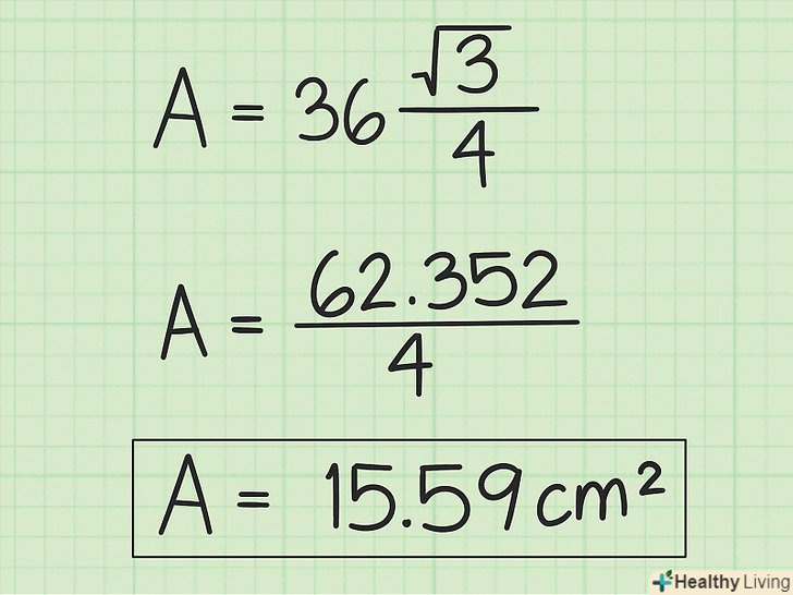 Таким чином, площа рівностороннього трикутника, сторони якого дорівнюють 6 см, приблизно дорівнює 15,59 квадратних сантиметрів.