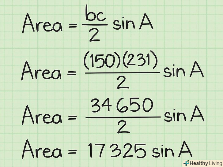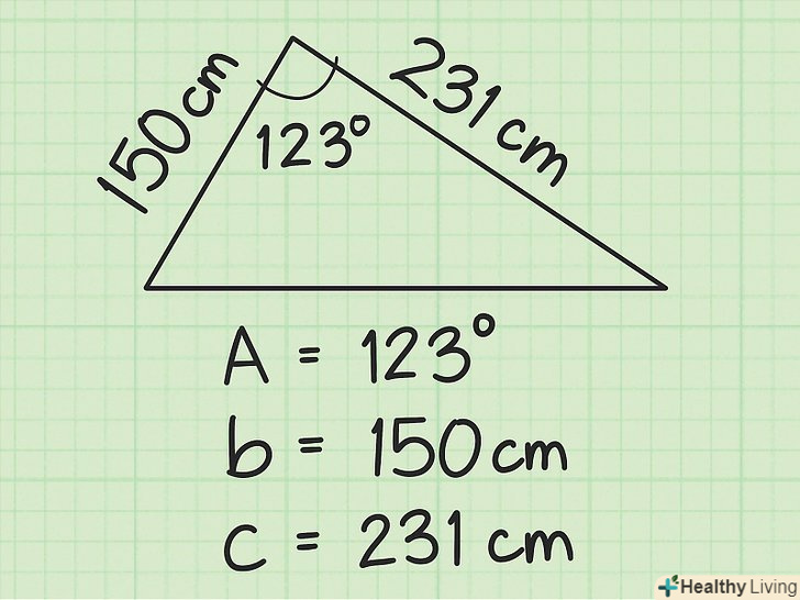 Знайдіть довжини двох суміжних сторін і прилеглий кут.суміжні сторони сходяться в одній вершині трикутника.[6] прилеглий Кут знаходиться між суміжними сторонами.- Наприклад, дано трикутник, суміжні сторони якого рівні 150 см і 231 см, а кут між ними дорівнює 123 градуси.