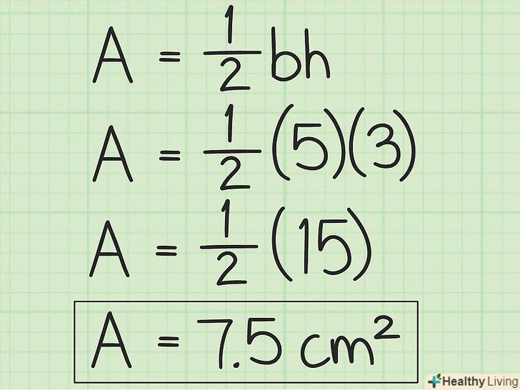 - Наприклад, якщо основа трикутника дорівнює 5 см, а висота дорівнює 3 см, то обчислення виглядають так: