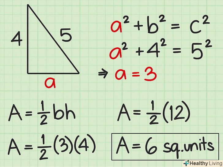 Знайдіть площу прямокутного трикутника.Так як дві сторони (катети) прямокутного трикутника перпендикулярні, один з катетів є висотою, а другий — підставою. Таким чином, якщо значення підстави і висоти в задачі не дані, можна визначити їх по довжинах сторін трикутника. Площа трикутника обчислюється за формулою:- Також можна користуватися цією формулою, якщо відомий тільки один катет і гіпотенуза. Гіпотенуза-це сторона прямокутного трикутника, протилежна прямому куту. Пам'ятайте, що невідому сторону прямокутного трикутника можна знайти Потеоремі Піфагора: