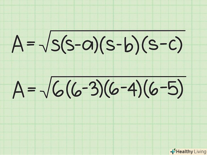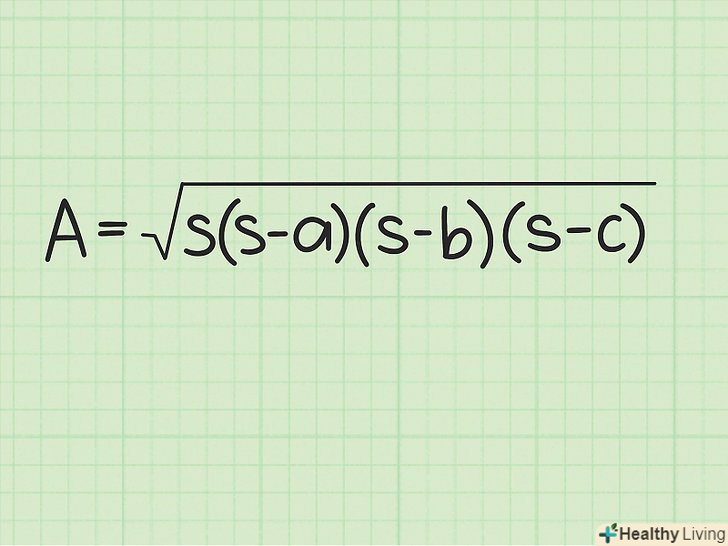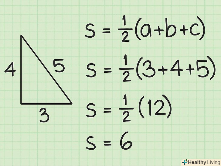 Обчисліть напівпериметр трикутника.напівпериметр фігури дорівнює половині її периметра. Щоб знайти напівпериметр, спочатку потрібно обчислити периметр трикутника, тобто скласти значення трьох сторін, а потім периметр розділити на 2 (або помножити на).[2] зверніть увагу: тут і далі на малюнках напівпериметр позначений як