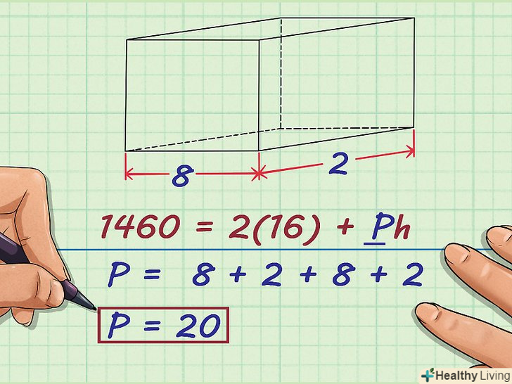 Знайдіть периметр основи. щоб знайти периметр прямокутника, складіть значення всіх (чотирьох) сторін; щоб знайти периметр квадрата, помножте значення однієї сторони на 4.- Пам'ятайте, що протилежні сторони прямокутника рівні.[6]