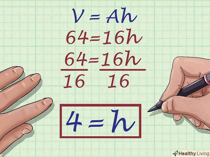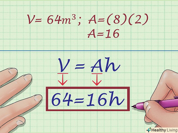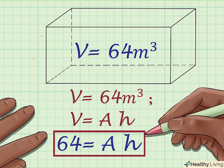 У формулу підставте обсяг.якщо обсяг не дано, цей метод використовувати не можна.- Приклад: об'єм призми дорівнює 64 кубічних метрів (м3); формула запишеться так: