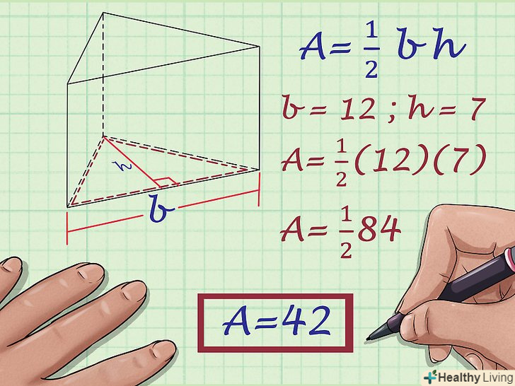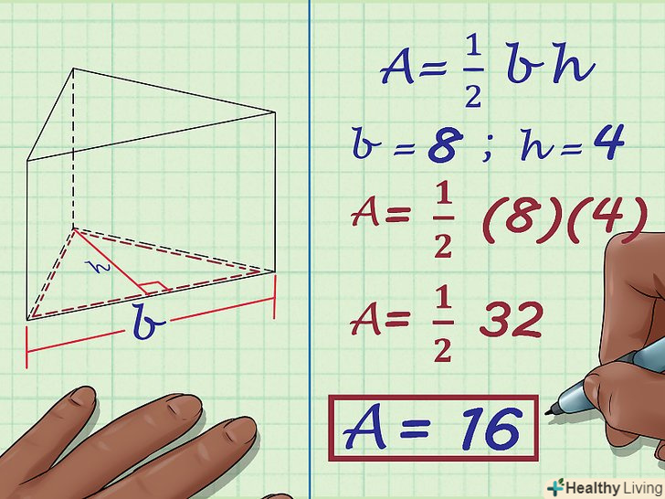 Обчисліть площу основи.для цього потрібно знати висоту трикутника і сторону, на яку опущена висота. Щоб обчислити площу трикутника, скористайтеся формулою.