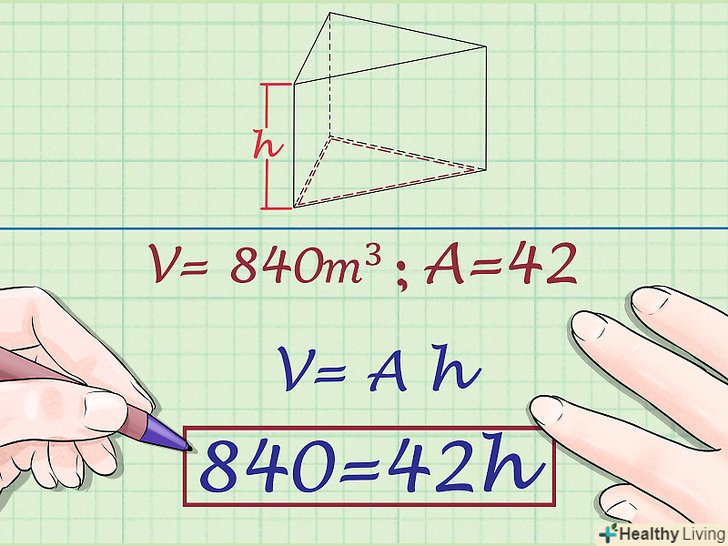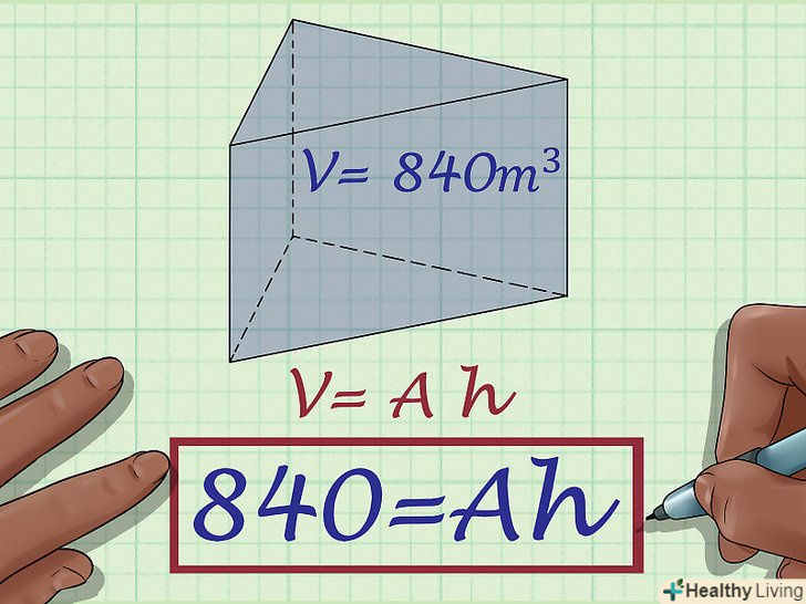 У формулу підставте обсяг.якщо обсяг не дано, цей метод використовувати не можна.- Приклад: об'єм призми дорівнює 840 кубічних метрів (м3); формула запишеться так: