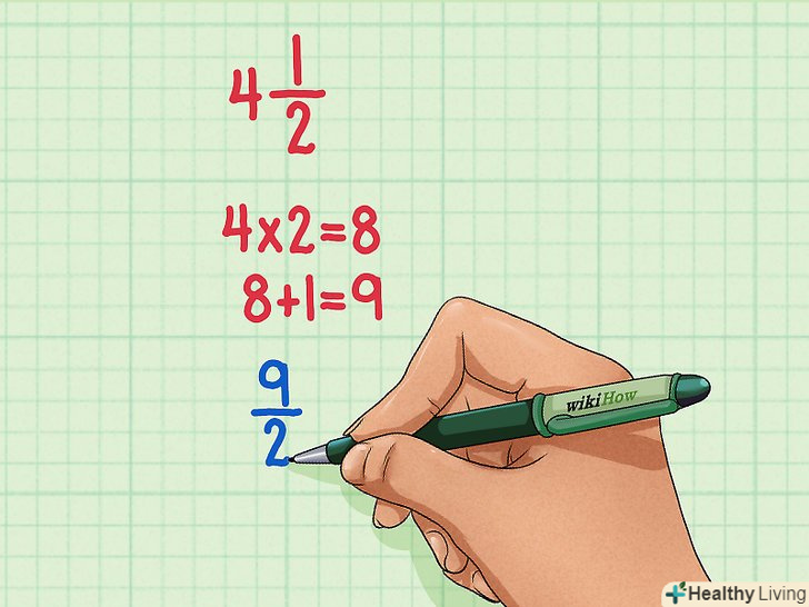 - Помістіть це значення (9) в чисельник неправильного дробу, а знаменник залиште колишнім (2). Таким чином, змішане число 41/2 перетворюється в неправильну дріб 9/2.