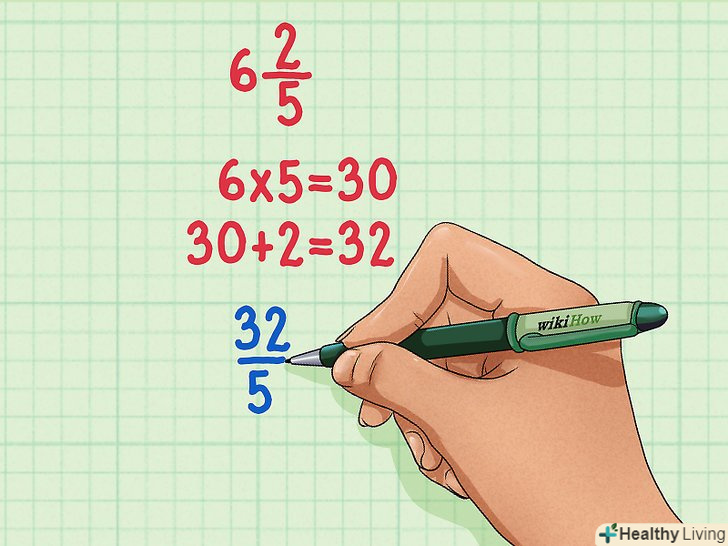 при перетворенні числа 62/5 в неправильну дріб спочатку помножте цілу частину (6) на знаменник дробу (5): 6*5 = 30.
