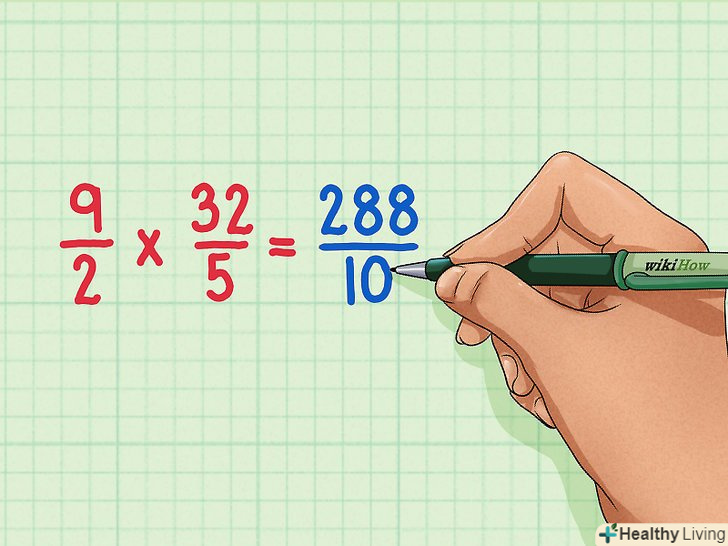 Помножте дві неправильні дроби. після того, як ви перетворите кожне змішане число в неправильну дріб, ви можете помножити ці дроби. Для цього відповідно перемножте їх чисельники і їх знаменники.- Щоб помножити9/2на 32/5, потрібно перемножити чисельники 9 і 32: 9*32 = 288.