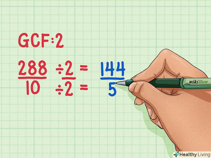 Скоротіть отриманий дріб.для цього знайдіть найбільший спільний дільник – НСД) - найбільше число, на яке ділиться і чисельник, і знаменник. Потім розділіть чисельник і знаменник на це число.- 2 є НСД для 288 і 10. Розділіть 288 на 2, щоб отримати 144, і розділіть 10 на 2, щоб отримати 5.