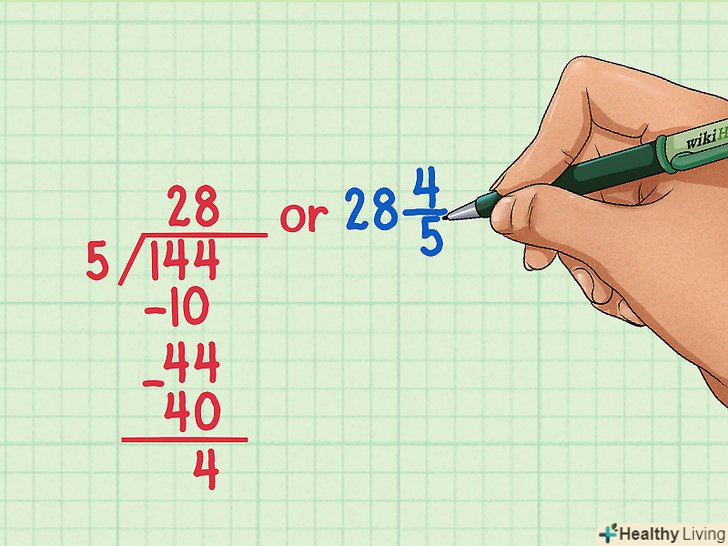 Перетворіть свою відповідь на змішане число.оскільки в задачі дані змішані числа, то і відповідь повинна бути дана у вигляді змішаного числа. Щоб перетворити неправильну дріб в змішане число, виконайте описану процедуру в зворотному порядку.- Спочатку розділіть чисельник на знаменник. Розділіть 144 на 5 і отримайте ПРИВАТНЕ 28 з залишком 4.
