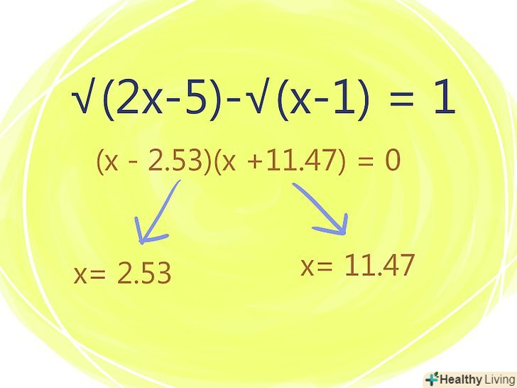 - Таким чином, відкиньте сторонній корінь х1 = 2,53 і запишіть відповідь: x2 = 11,47.