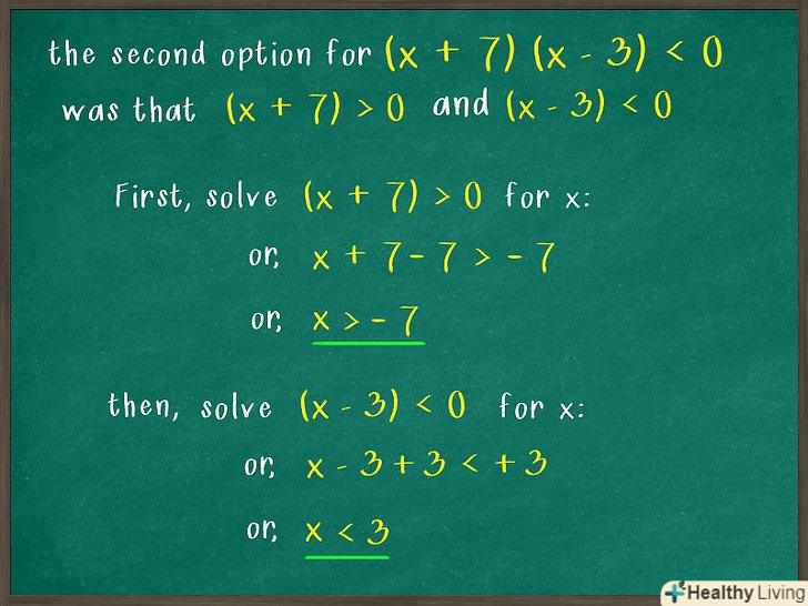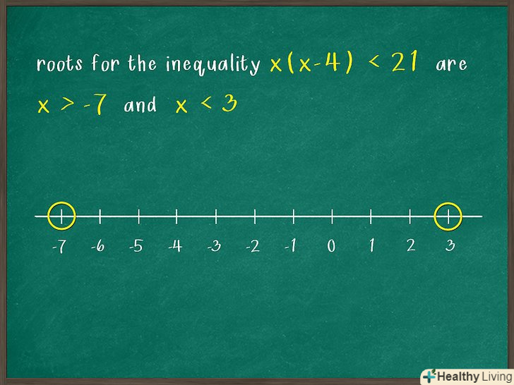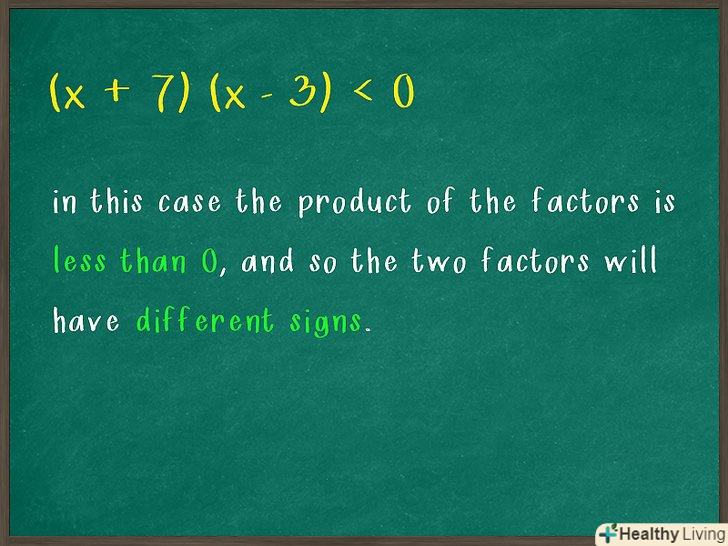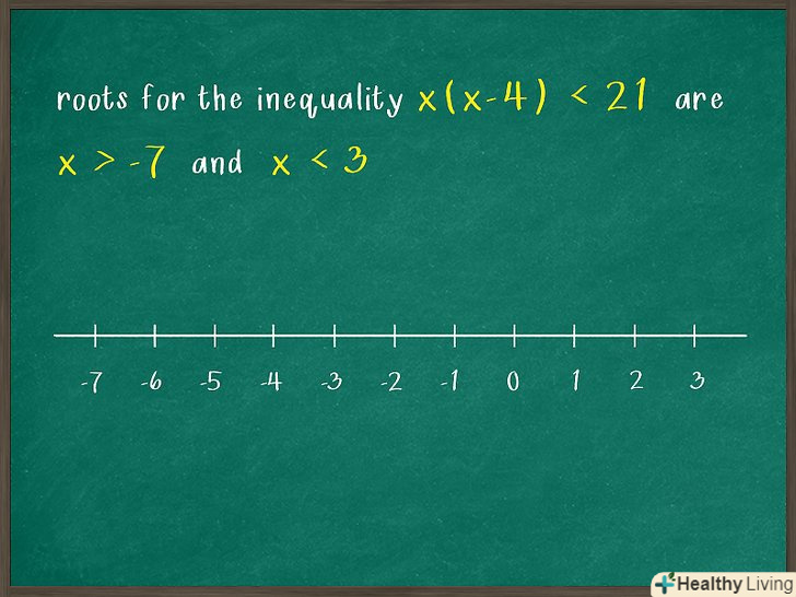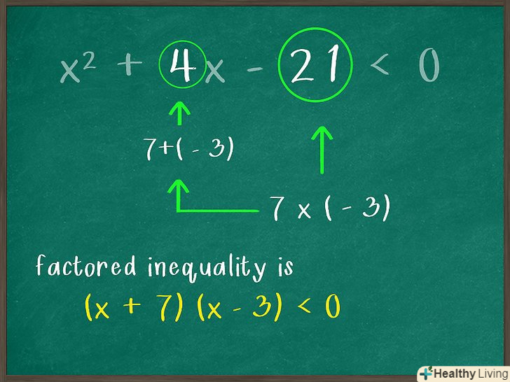 - Третій член нерівності дорівнює -21, тому його можна розкласти на множники 7 і -3. Тепер перевірте, чи дорівнює сума цих чисел коефіцієнту (